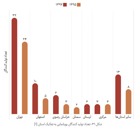 مقایسه آماری جالبی هم از تعداد تولیدکنندگان این صنعت در سال‌های ۱۳۹۵ و ۱۳۹۷ وجود دارد: در سال اول ۴۵ تولیدکننده فعال بودند و این عدد در سال دوم به ۶۷ رسید. تهران با ۳۲ استودیو، اصفهان با ۱۰ و خراسان رضوی با ۶، بیشترین سهم را داشتند.