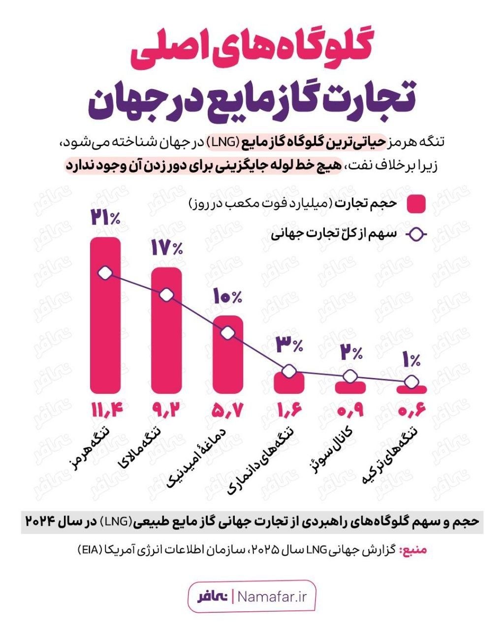 به گزارش روابط عمومی سازمان تبلیغات اسلامی، بررسی دادههای «گزارش جهانی LNG ۲۰۲۵» سازمان اطلاعات انرژی آمریکا (EIA) نشان میدهد تنگه هرمز نقشی بیجایگزین در تجارت جهانی گاز طبیعی مایع ایفا میکند. بر اساس این گزارش که توسط مؤسسه نمافر بازنشر و در قالب یک اینفوگرافی منتشر شده، حدود ۲۱ درصد از کل جابهجایی LNG جهان – معادل ۱۱.۴ میلیارد فوتمکعب در روز – از این مسیر انجام میشود.
