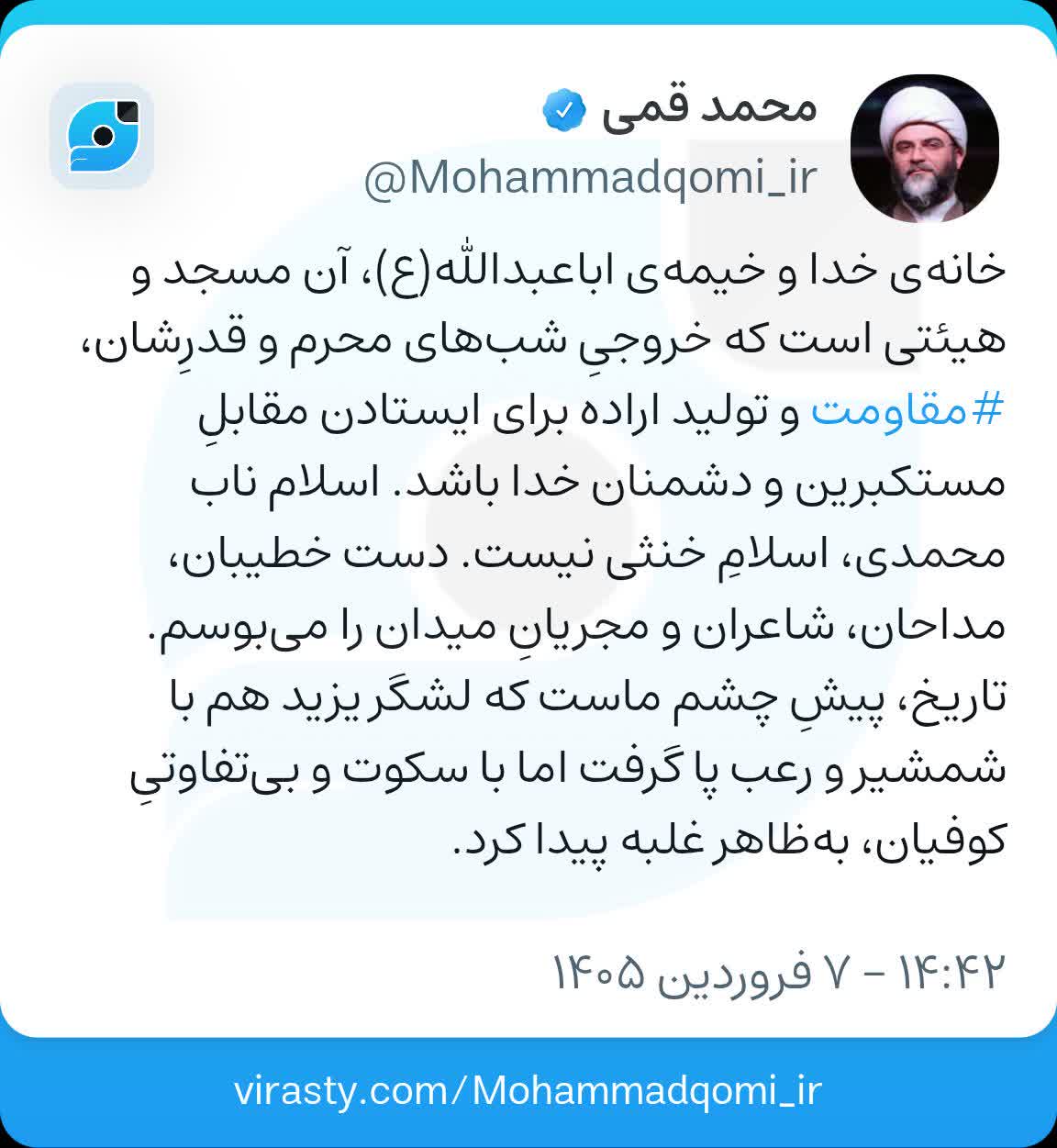 خانه‌ی خدا و خیمه‌ی اباعبدالله (ع)، آن مسجد و هیئتی است که خروجیِ شب‌های محرم و قدرِشان، مقاومت و تولید اراده برای ایستادن مقابلِ مستکبرین و دشمنان خدا باشد. اسلام ناب محمدی، اسلامِ خنثی نیست. دست خطیبان، مداحان، شاعران و مجریانِ میدان را می‌بوسم.تاریخ، پیشِ چشم ماست که لشگر یزید هم با شمشیر و رعب پا گرفت اما با سکوت و بی‌تفاوتیِ کوفیان، به‌ ظاهر غلبه پیدا کرد.