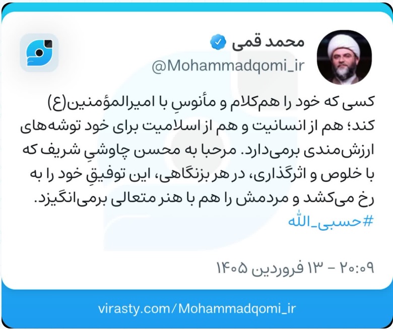 کسی که خود را همکلام و مأنوسِ با امیرالمؤمنین(ع) کند؛ هم از انسانیت و هم از اسلامیت برای خود توشههای ارزشمندی برمیدارد. مرحبا به محسن چاوشیِ شریف که با خلوص و اثرگذاری، در هر بزنگاهی، این توفیقِ خود را به رخ میکشد و مردمش را هم با هنر متعالی برمیانگیزد.