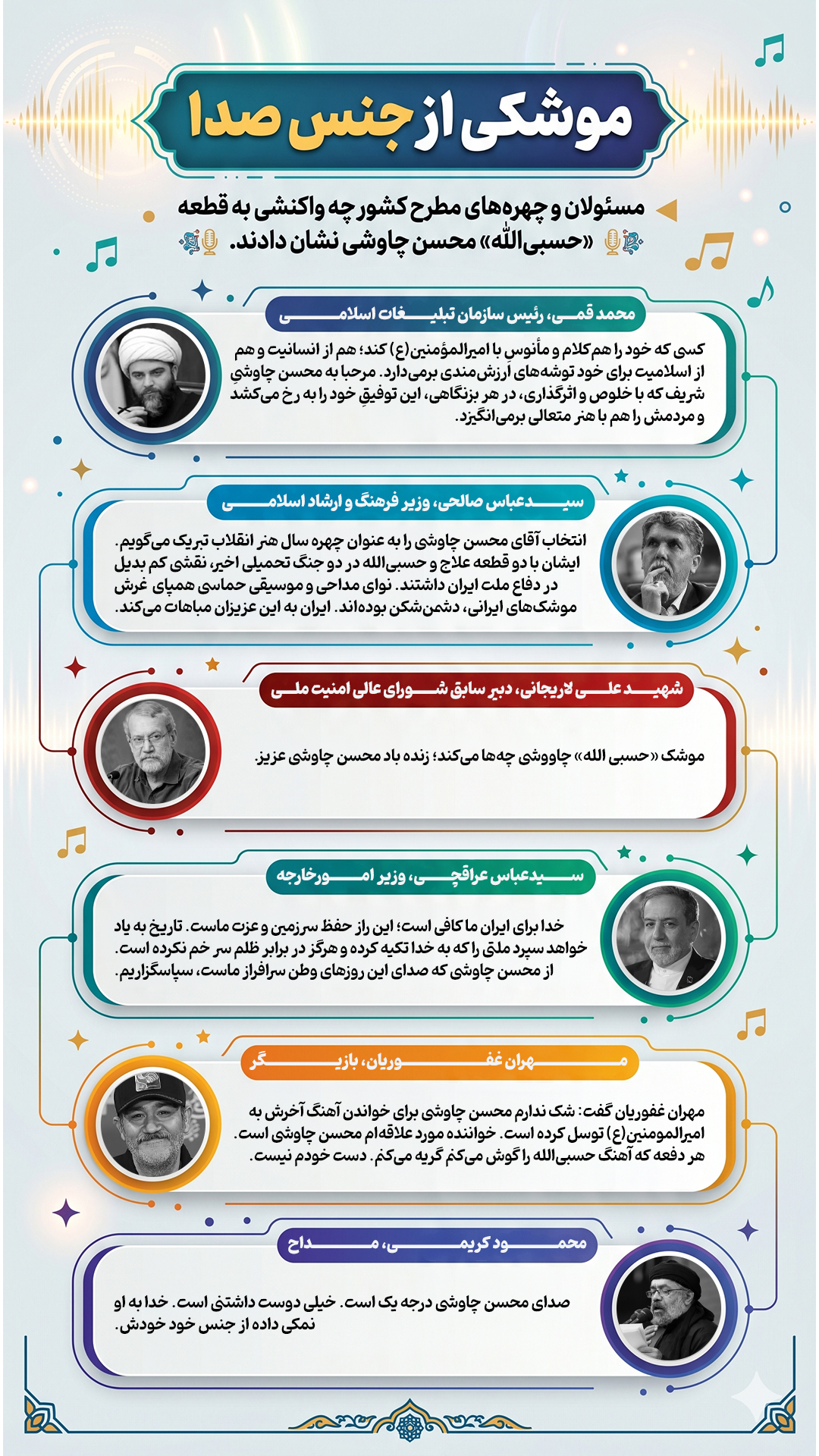محسن چاوشی، با انتشار دو قطعه «علاج» و «حسبیالله» در سال ۱۴۰۴ که کشورمان درگیر دو جنگ تحمیلی ۱۲ روزه و رمضان بود، موسیقی را به مفهوم وطندوستی گره زد و نقش زیادی در ایجاد همبستگی مردم کشورمان داشت و در نهایت نیز به عنوان چهره سال هنر انقلاب اسلامی در سال ۱۴۰۴ برگزیده شد. واکنش برخی از مسئولان و چهرههای مطرح کشور درباره آثار این خواننده محبوب در فضای مجازی را بخوانید.
