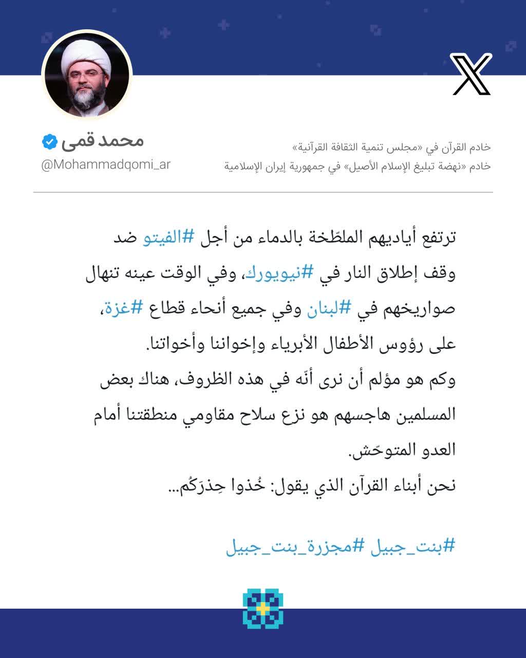 به گزارش روابط عمومی سازمان تبلیغات اسلامی، حجتالاسلام محمد قمی، رئیس سازمان تبلیغات اسلامی، در صفحه شخصی خود در شبکه اجتماعی ایکس پس از حملهی تروریستی به خودرو یک خانواده شش نفره در جنوب لبنان که موجب به شهادت رسیدن تمامی اعضای این خانواده شد به زبان عربی نوشت؛