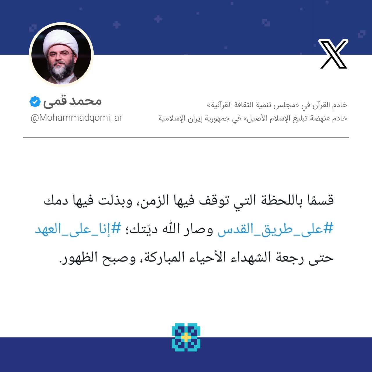 همچنین حجتالاسلام قمی همین متن را به زبانی عربی در شبکه اجتماعی ایکس نیز منتشر کرد.