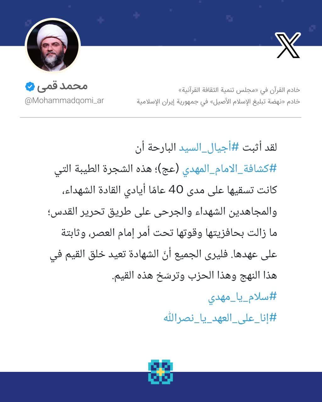 به گزارش روابط عمومی سازمان تبلیغات اسلامی، حجتالاسلام محمد قمی، رئیس سازمان تبلیغات اسلامی به مناسبت بزرگداشت اجتماع عظیم و تاریخی گروههای پیشاهنگی امام مهدی در تشکیلات حزبالله لبنان، که برای سالروز چهلسالگی این شجرهی طیّبه، در ورزشگاه محل بدرقهی پیکر سید شهدای امّت در بیروت برگزار شده بود در صفحه شخصی خود در شبکه اجتماعی ایکس ویژه مخاطبان عرب زبان نوشت؛